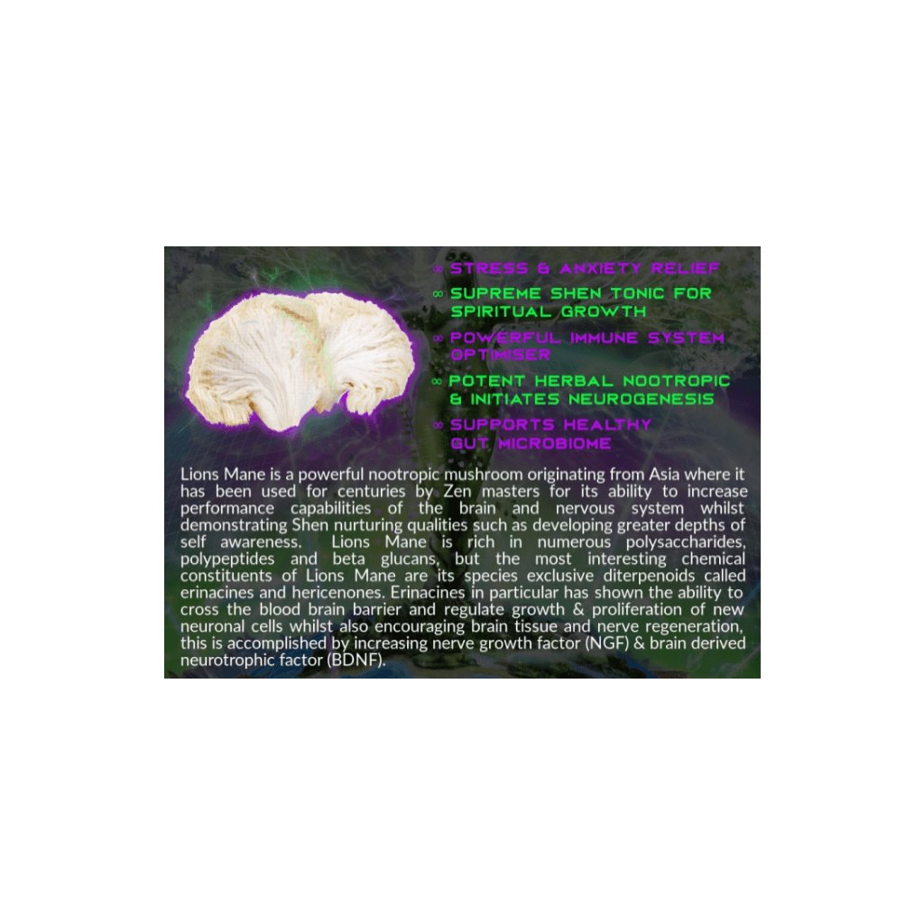Lví hříva je silná nootropní houba z Asie, která byla po staletí využívána zenovými mistry k podpoře mozkové výkonnosti a nervového systému. Tradiční čínská medicína (TČM) ji cení pro "Shen" pěstící vlastnosti, jako je rozvoj hlubšího sebeuvědomění. Kromě své oblíbenosti jako kulinářská pochoutka v Orientu získává Lví hříva stále větší popularitu pro své terapeutické účinky. Výzkumy prokazují její neurotrofické vlastnosti, přičemž hericenony a erinaciny v této houbě stimulují tvorbu nervových růstových faktorů v mozku, což přispívá k regeneraci a růstu nervových buněk.