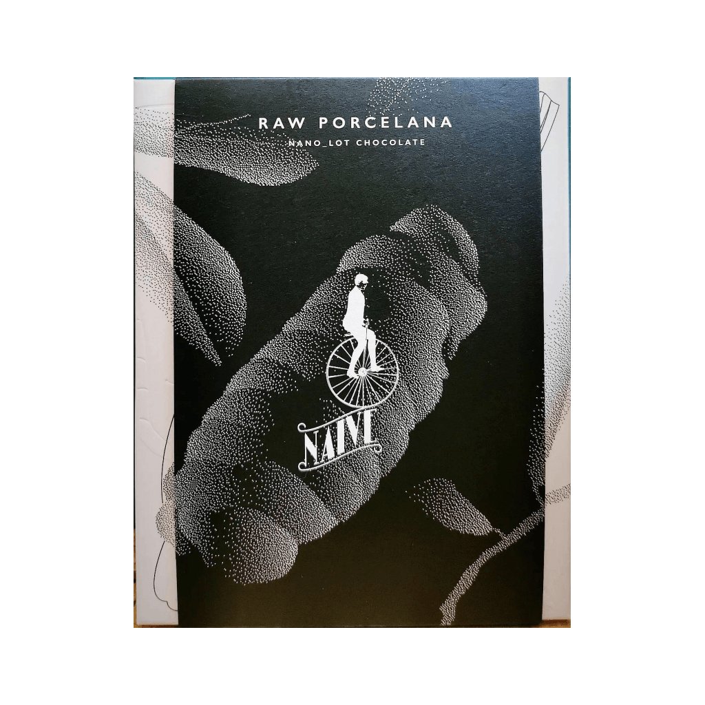 RAW PORCELANA od Naive je nejsilnější čokoláda, jakou Domantas Užpalis kdy vytvořil. Určena pro nejdrsnější povahy je uměleckým dílem s nejvyšším obsahem bioaktivních látek surových světlých porcelánových bobů (bílé kakao) z Kolumbie (Hacienda Betulia criollo porcelana). Díky surovému zpracování, které bylo vyvinuto s Litevskými vědci a použito poprvé pro výrobu fialové čokolády Molecules a díky použití nejdrsnější odrůdy bílého Kolumbijského criolla, je tato čokoláda vzpruhou, ,,která postaví na nohy i mrtvého". Je třeba ji brát po malinkých kouscích v terapeutické dávce spíše jakoby šlo o doplněk stravy.