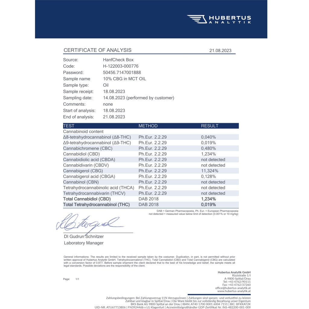 Certifikát poslední šarže: (CBG 10% v MCT oleji)