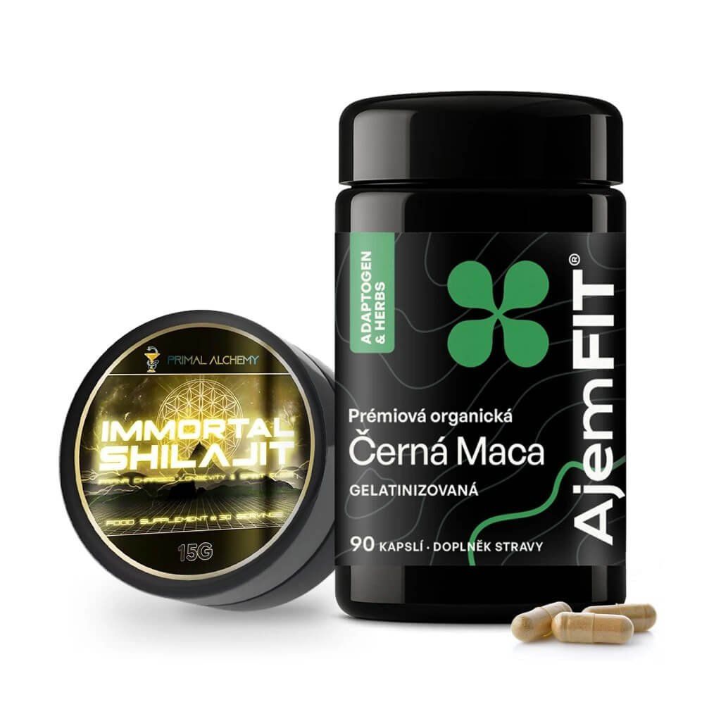 Balení: Shilajit Zlatá Třída (15 g) + Organic Černá Maca (90 kapslí) · cca 30 dávek (na 30 dní)