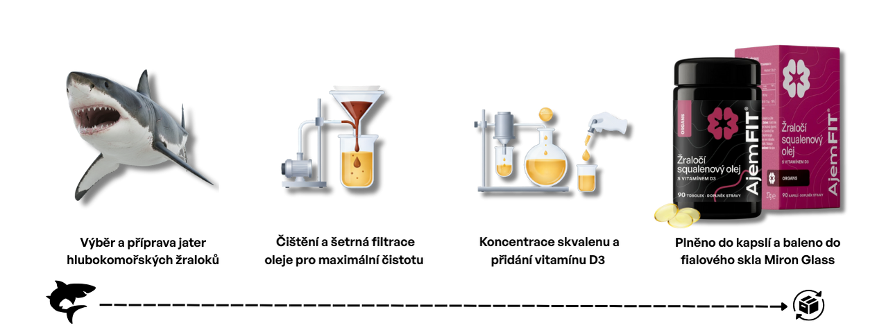 Prémiový žraločí squalenový olej je získáván z hlubokomořských žraloků žijících v extrémních hloubkách. Olej z jater je pečlivě zpracován tradičními i moderními metodami, jsou zajištěny etické a ekologické standardy. Vysoký obsah skvalenu (98%) v kapsli a přidaný přírodní vitamín D3 zaručuje maximální sílu bez kompromisů. Výsledný olej je skladován ve fialovém skle Miron Glass, které chrání každou tobolku před světlem a vlhkostí a zachovává čerstvost až do poslední dávky.