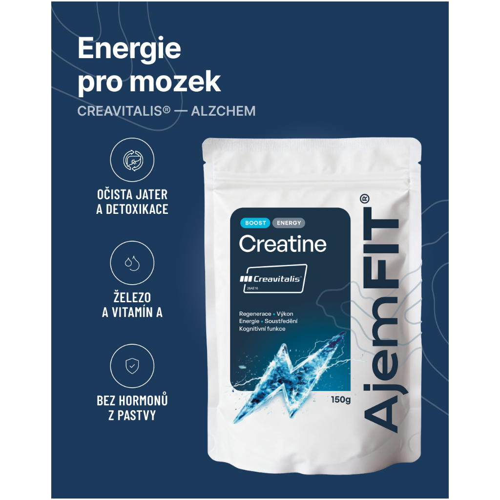 AjemFIT Creatine je 100% kreatin monohydrát Creavitalis® od německého výrobce AlzChem — stejné společnosti, která vytvořila legendární Creapure®. Creavitalis® je jejich nová linie zaměřená na zdraví a vitalitu, vyráběná patentovanou syntézou ze sarkosinátu a kyanamidu s garantovanou čistotou ≥99,9 % v každé šarži. Kreatin je nejprozkoumanější sportovní suplement na světě — tisíce studií, nulové závažné vedlejší účinky, prokazatelný efekt na svalový výkon, regeneraci i kognitivní funkce. K dispozici ve variantách 150 g (30 dávek) a 300 g (60 dávek) v praktickém doypacku.