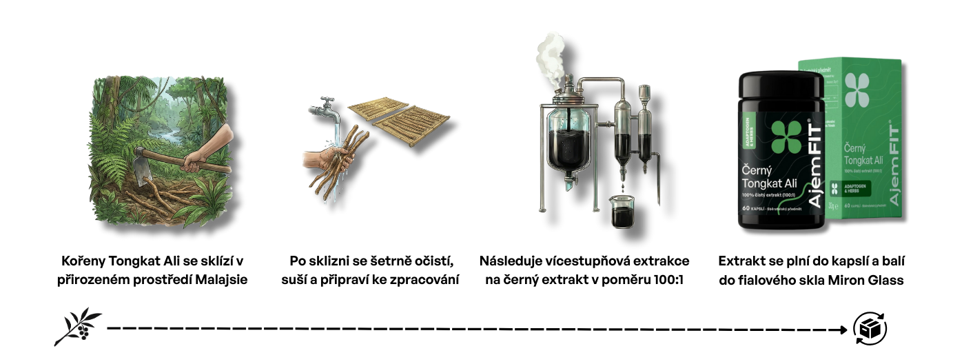 Tongkat Ali je zpracováván z kořene rostliny Eurycoma longifolia pěstované v Malajsii. Používáme pouze černý extrakt v poměru 100:1, který je standardizován na 1–3 % eurycomanonu – jedné z klíčových bioaktivních látek. Šetrný proces extrakce zachovává všechny důležité látky, včetně eurycomanonu, který je klíčový pro podporu přirozené produkce testosteronu. Na rozdíl od běžných metod zpracování tento postup zajišťuje čistý, koncentrovaný extrakt bez chemie, GMO a plnidel, což vám přináší skutečnou sílu malajského ženšenu v každé kapsli.