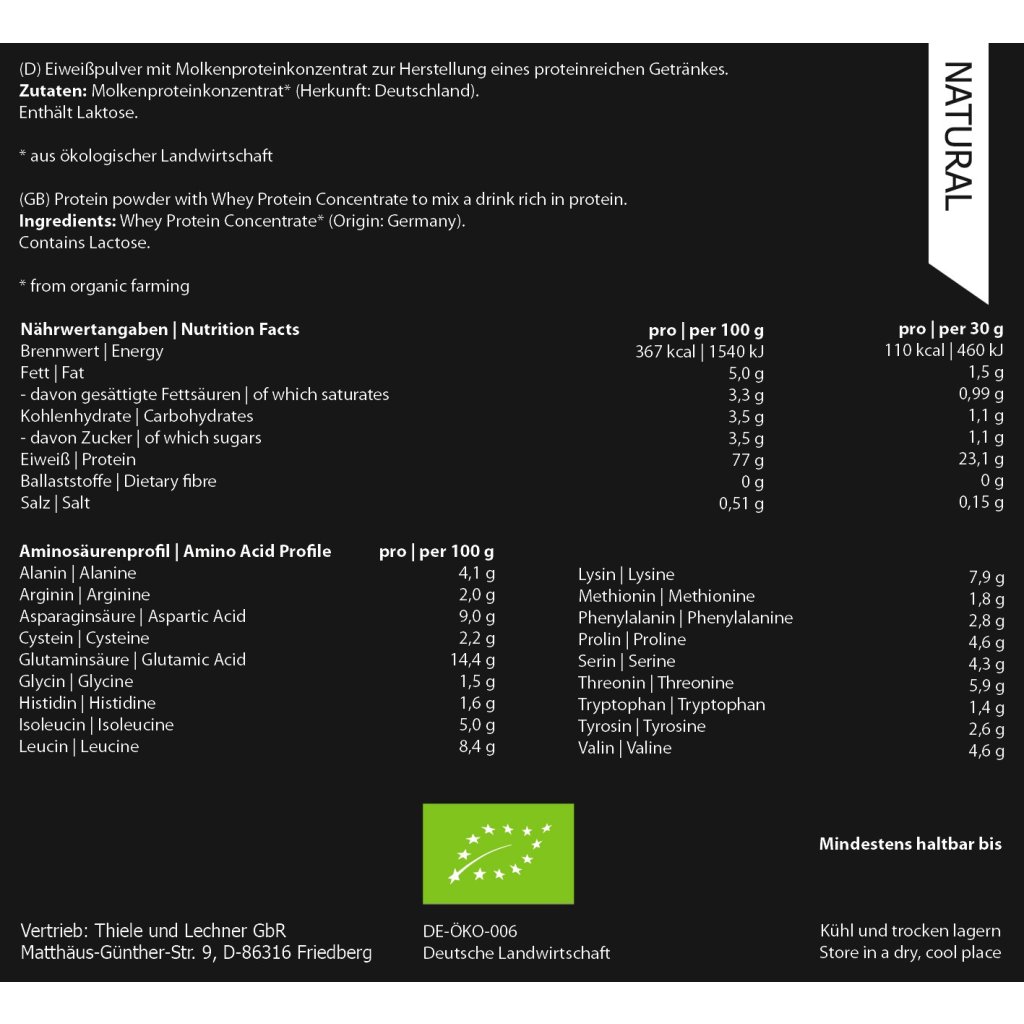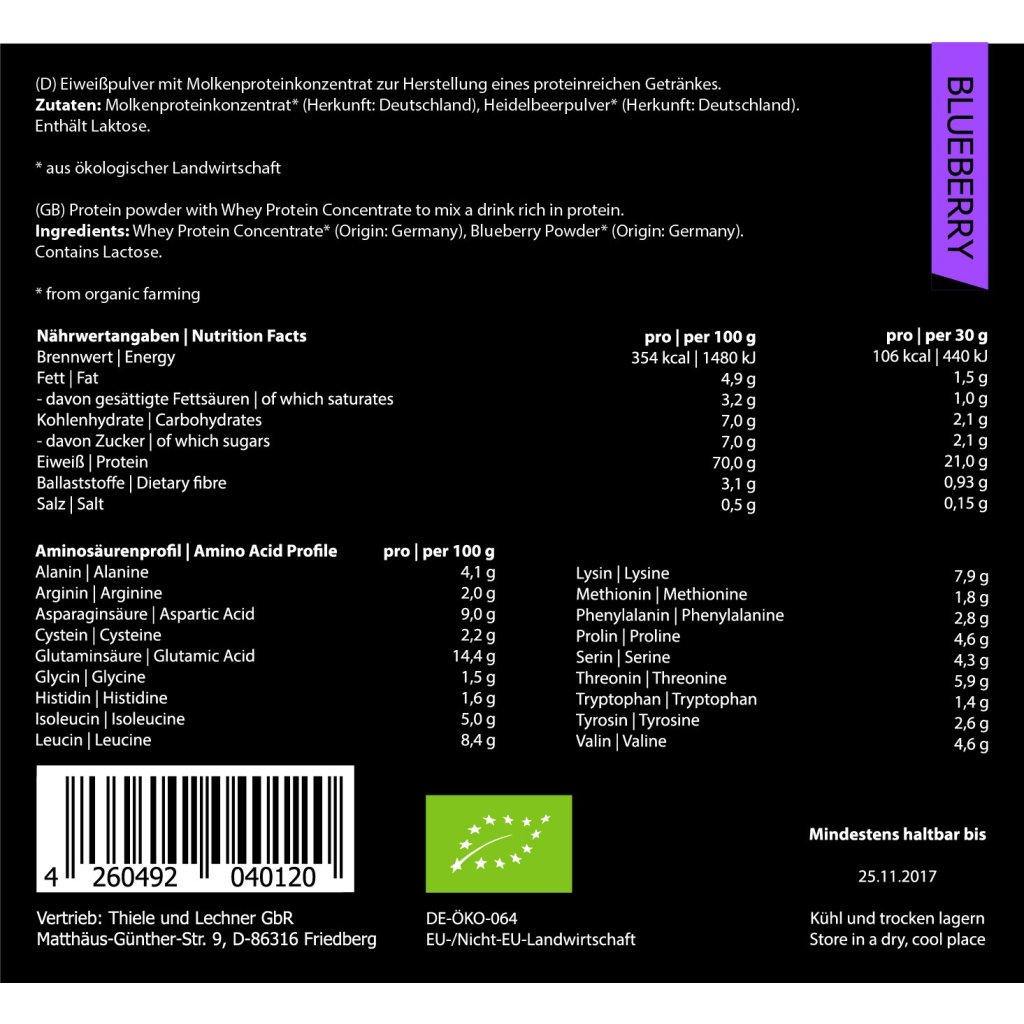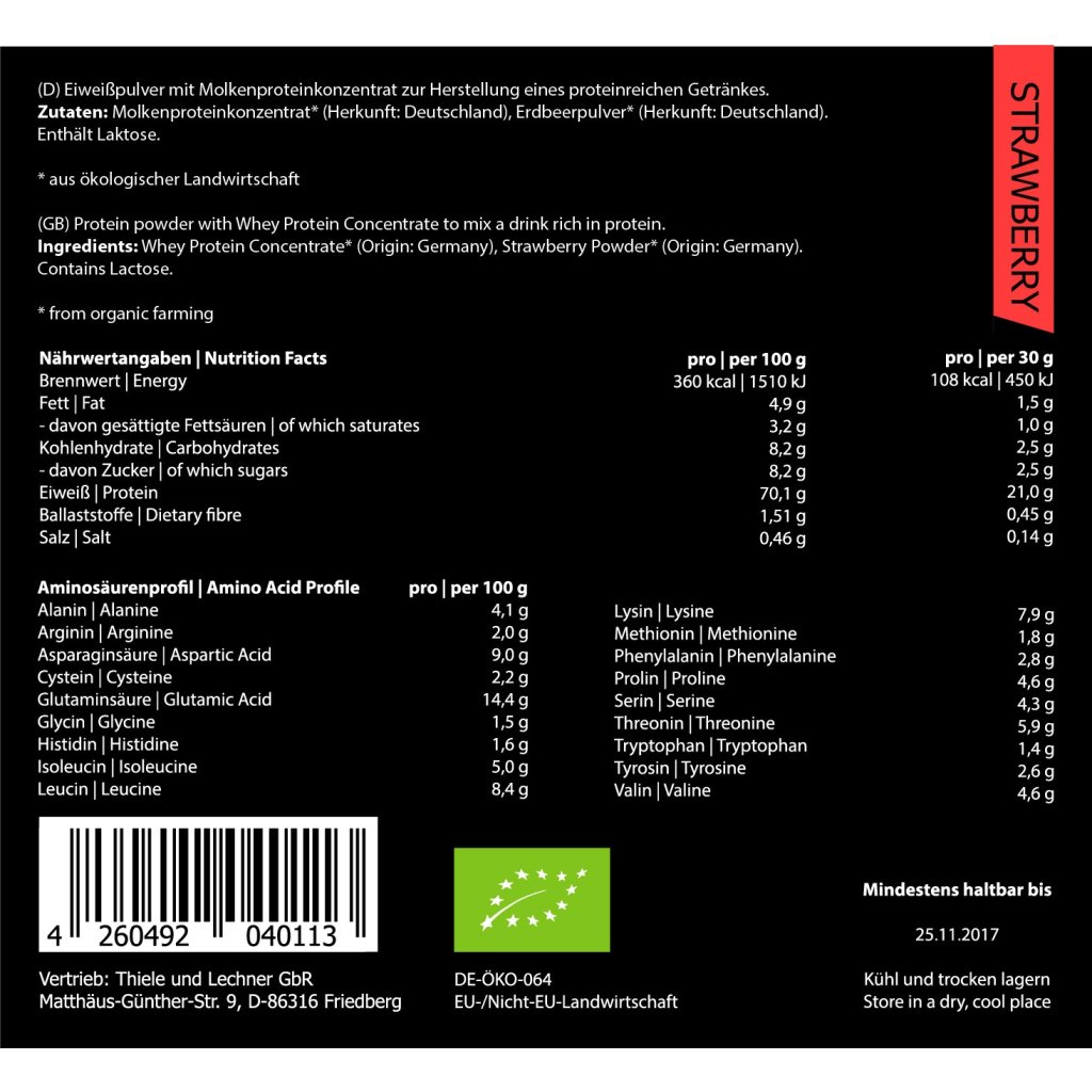 Nutriční hodnoty ve 100g : Energie 1540kJ/367kcal ,Tuky 5g z toho saturované 3,3g ,Uhlohydráty 3,5g z toho jednoduchý cukr 3,5g ,Bílkoviny 77g ,Sůl 0,51g Nutriční hodnoty jsou založeny na příchuti Natural a u jiných příchutí se mohou mírně lišit. Složení: Bio koncentrát syrovátkové bílkoviny*, Bio odtučněný kakaový prášek* (jenom příchuť Kakao), Bio vanilkový prášek z Tahiti*(jenom příchuť Vanilka), Bio borůvkový prášek*(jenom příchuť borůvka), Bio jahodový prášek*(jenom příchuť Jahoda). *Certifikované Bio suroviny z ekologického zemědělství