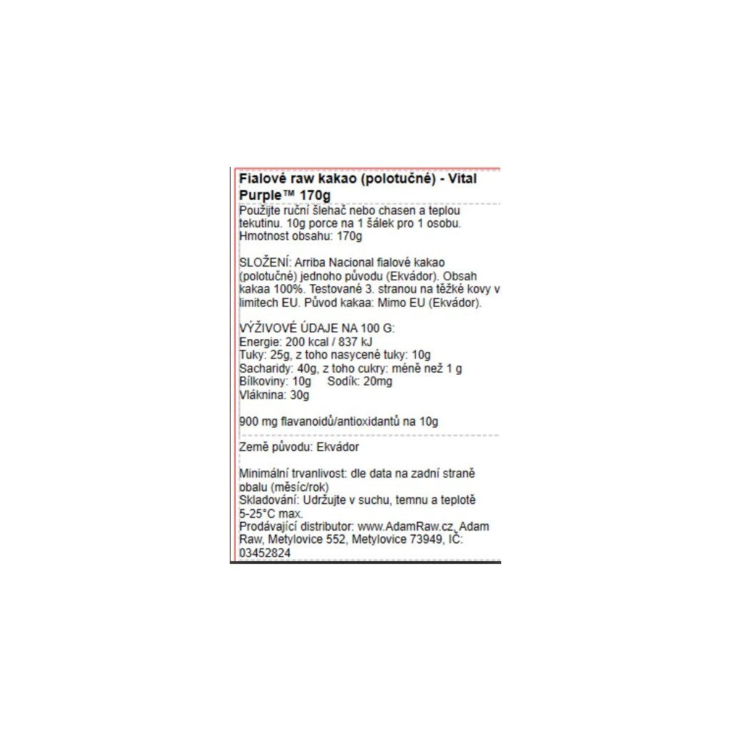 Navíc a hlavně - téměř všechno kakao/čokoláda na trhu které si dávají do názvu RAW nejsou skutečně surové, 99,9% je klamání spotřebitele a nedoručí ani bioaktivní efekt, ani složení látek či chuť pravého surového fialového kakaa. Pod značkou Naive Chocolate distribuujeme již 6 let jedinou a první čokoládu na trhu z fialových bobů a zpracovanou za nejnižších teplot ( https://www.adamraw.cz/purple-naive/ ), avšak VITAL PURPLE kakao ve formě prášku pro přípravu nápoje nebo do receptů je novou 100% formou pro mnohostranné využití.