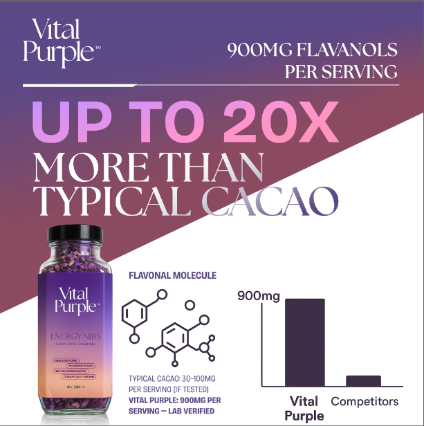 Pravé syrové fialové kakao je nejsilnější bioaktivní forma kakaa. Vital purple je testované na velmi nízké těžké kovy (hluboko pod limity EU) a zároveň na nejvyšší obsah flavanolů ze všech potravin (900mg flavanolů na dávku!). 100% přírodní RAW produkt z horského pěstování bez pesticidů a umělé chemie. Zpracováno komplet do 32°C. Bez GMO a aditiv.
