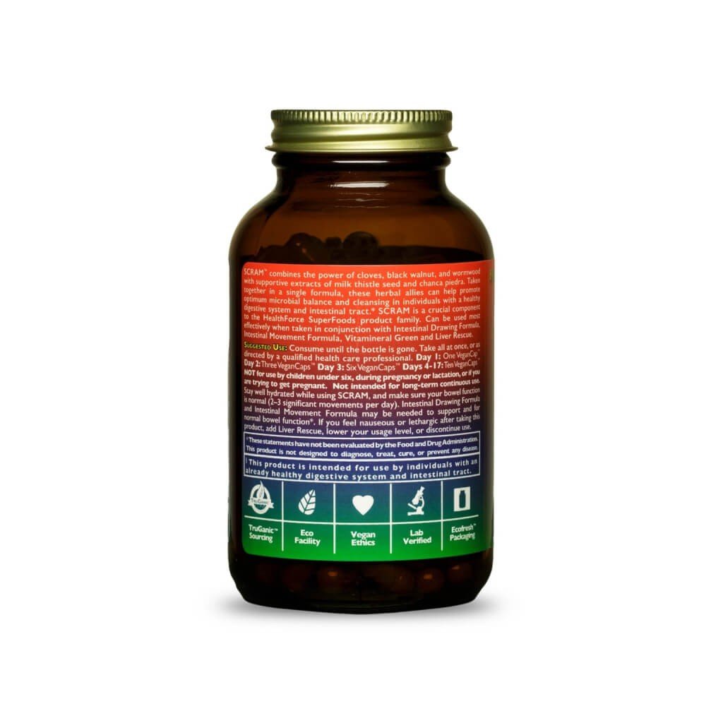 HealthForce SCRAM™ kombinuje osvědčené bylinné extrakty z hřebíčku, černého ořechu a pelyňku s výtažky ze semene ostropestřce mariánského a chanca piedra. Tyto bylinky v kombinaci s enzymy mohou podporovat optimální proces čištění organismu. Pro lepší výsledky doporučuje HealthForce kombinovat tento produkt s Liver Rescue.