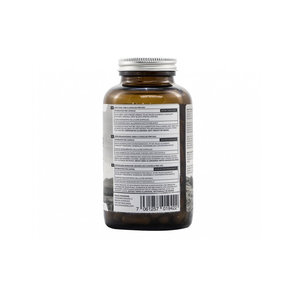 Protože jsme chtěli vyvinout doplněk stravy, který se blíží skutečné původní výživě, přidali jsme vlastní Paleo Elements Complex™. Tento doplněk se skládá z trochy surové novozélandské hovězí krve a evropské paleosoil (minerální směsi země z doby ledové). Tím získáte další důležité doplňkové živiny k již tak velmi výživným játrům. Nikoli v extrémním množství, ale tak akorát, jen pro doplnění a obohacení jater. Výhody Paleo Elements Complex™ zahrnují další minerály a stopové prvky, stejně jako červené a bílé krvinky a imunoproteiny.