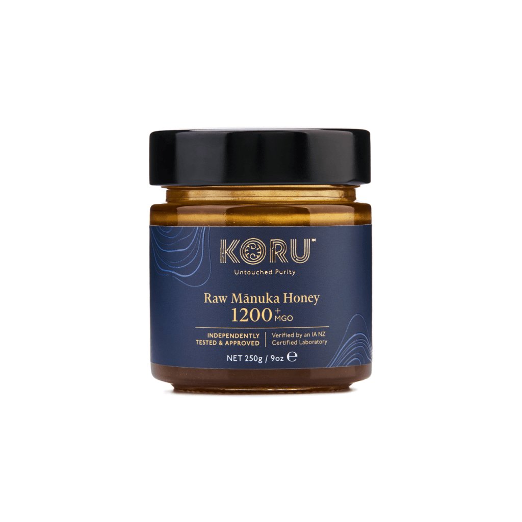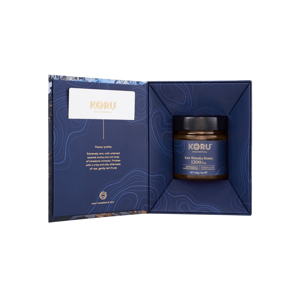 KORU Raw Manuka 1200+ MGO s nezkrotnou karamelovou vůní a bohatým minerálním tělem a vápencovými tóny je tento extrémně vzácný monokvětinový med po celém světě uctíván pro své širokospektrální jedinečné vlastnosti a neslýchaně vysokou hodnotu MGO díky certifikaci na nejméně 1 200 mg methylglyoxalu na kg.