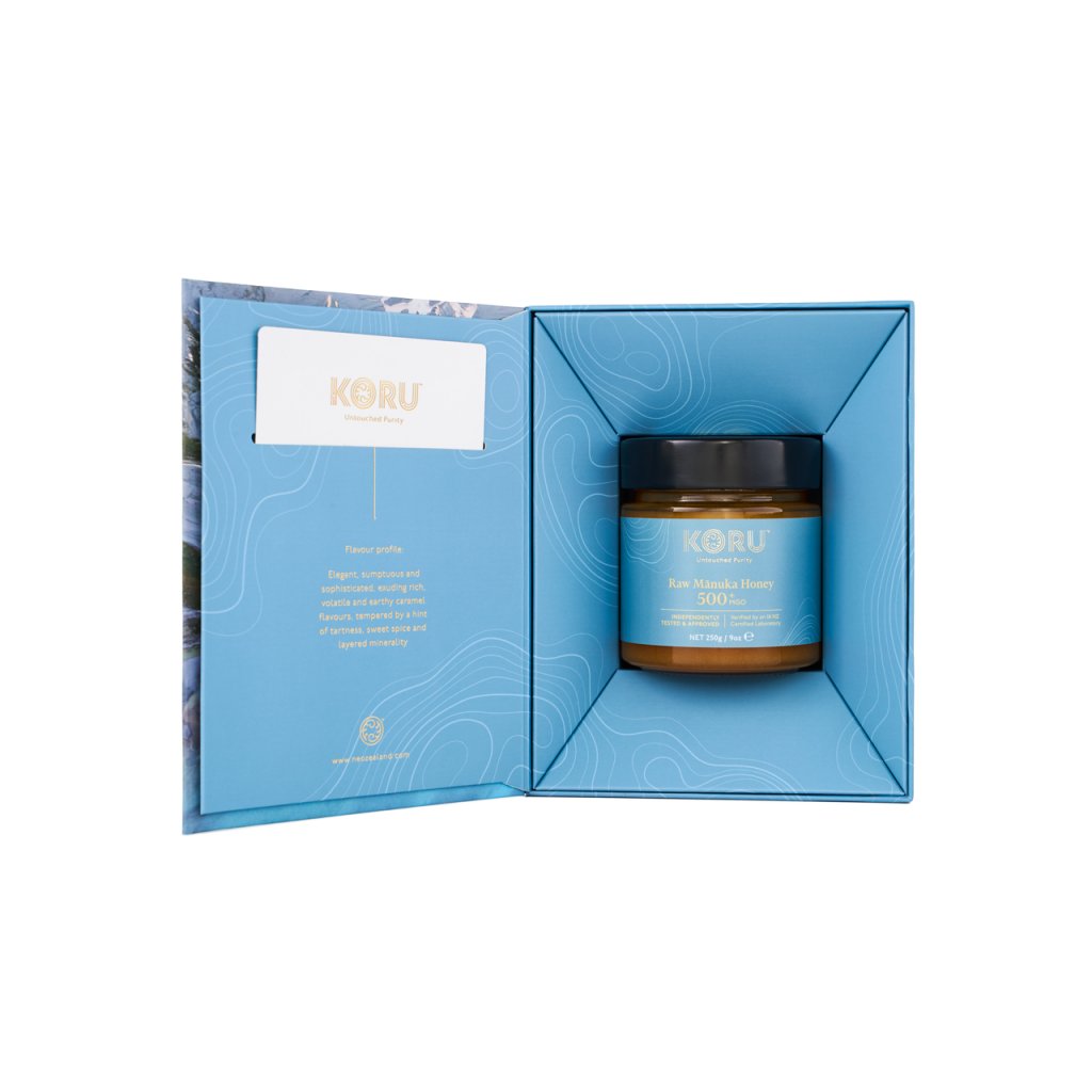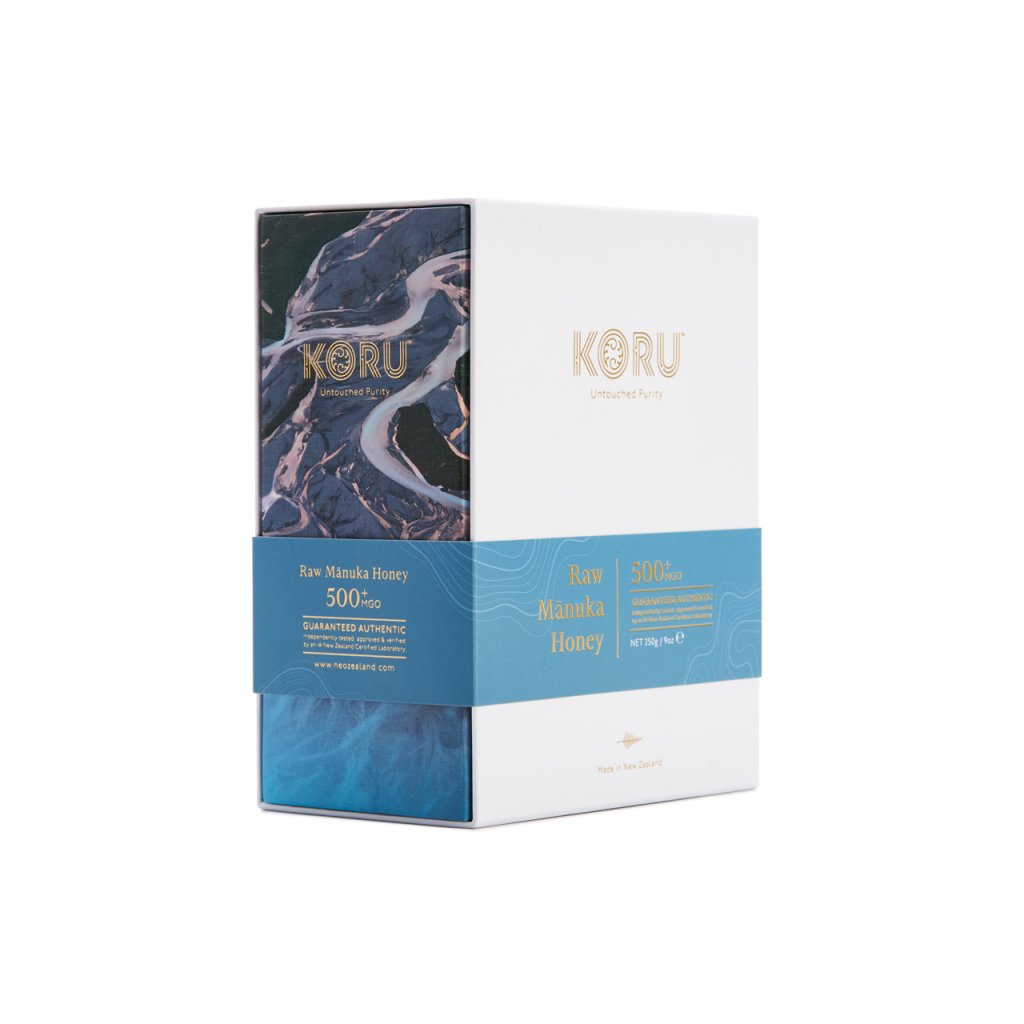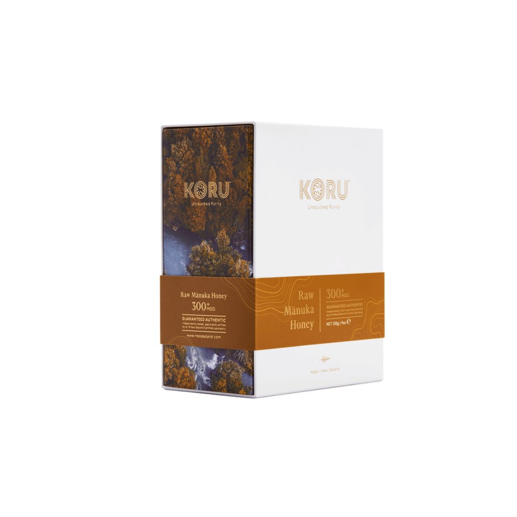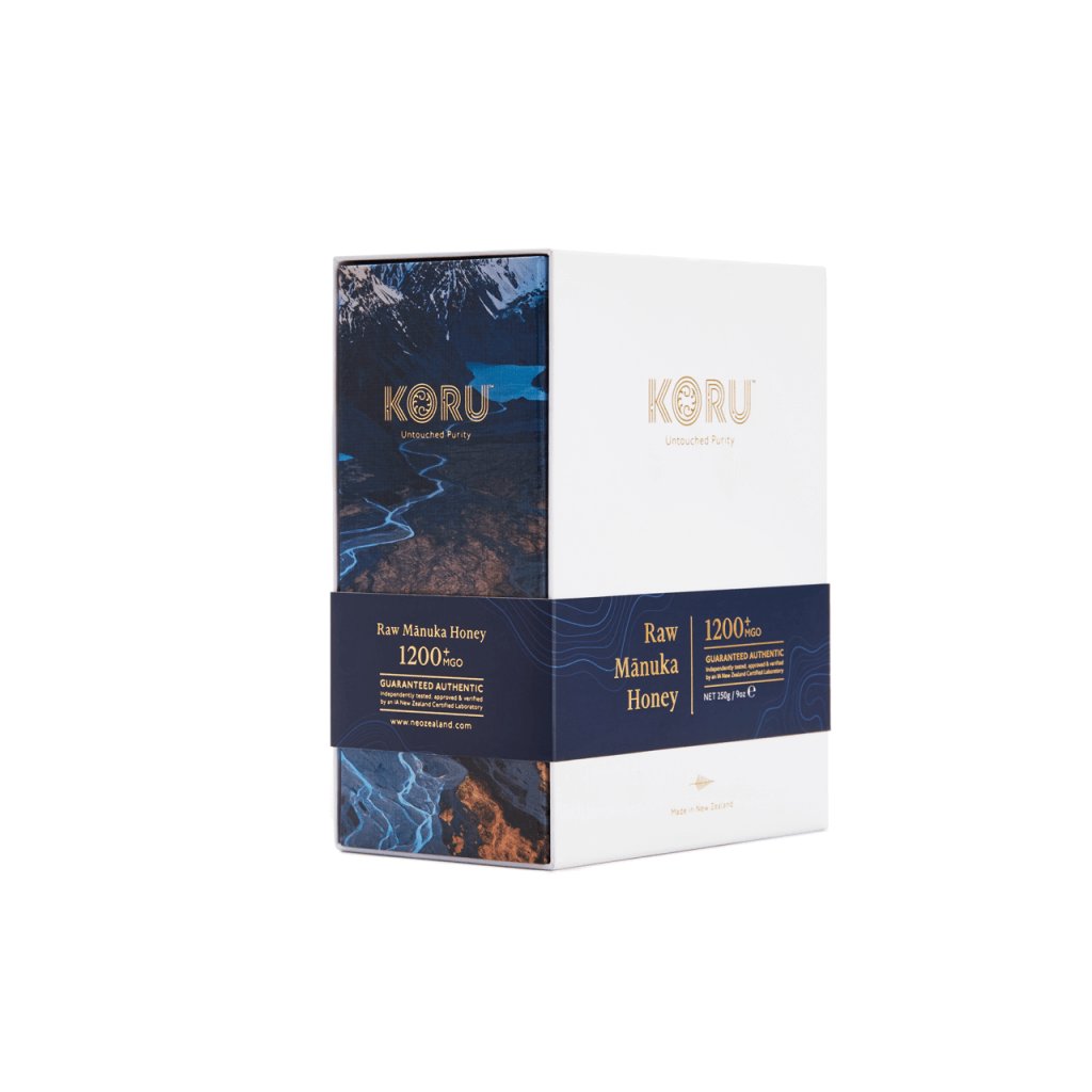 Produkt této kvality si zaslouží odpovídající prezentaci. Abychom zdůraznili luxusní charakter produktů KORU, používáme pečlivě navržené obaly s designem založeným na fotografiích nádherných přírodních scenérií Nového Zélandu. Tyto obaly nejen že vypadají jako luxusní dárek, ale také chrání med před škodlivými účinky světla. Elegance naší skleněné nádoby se značkou KORU je zabezpečena v pevné, vysoce kvalitní krabici pro optimální ochranu. Nejvyšší kvalita produktu a sofistikovaný design obalu definují naši značku."