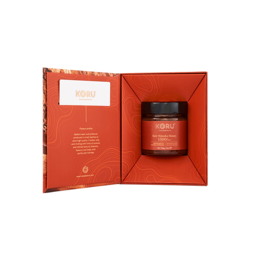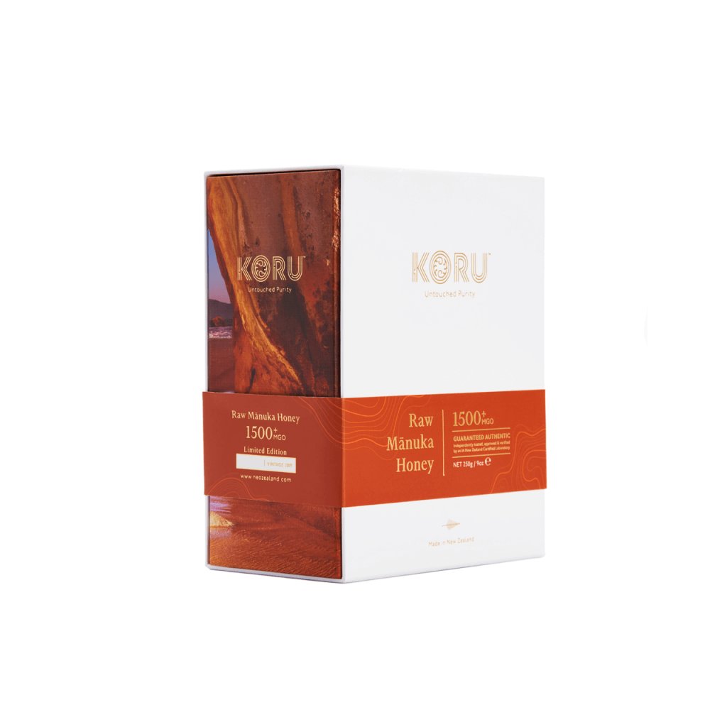 KORU Raw Manuka 1500+ MGO rozhodně není vtip. Pouze 137 kg tohoto ultra vzácného, raritního a do roku 2021 i nejsilnějšího Manukového medu bylo sklizeno v roce 2019, což KORU umožnilo zabalit pouze 500 sklenic pro vybrané zákazníky a celý světový trh. Tento ručně zpracovaný med je hedvábný s náznaky karamelu a magickou intenzitou. Živá, s čistotou a nesmírnou cenností je tato první KORU limitovaná šarže MGO 1500+ individuálně očíslována a umístěna do nádherných luxusních krabic. Je certifikováno, že obsahuje nejméně 1 500 mg methylglyoxalu na kg.