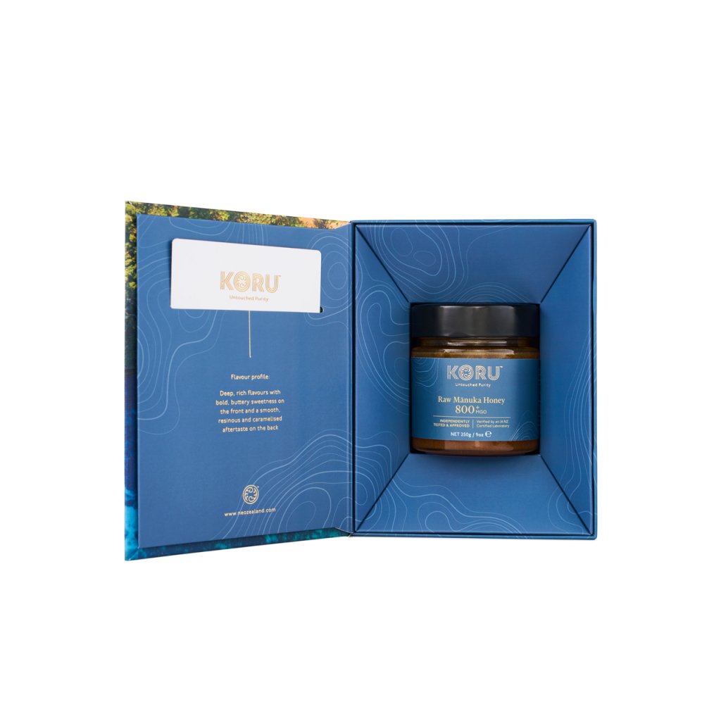 KORU Raw Manuka 800+ MGO je se svým certifikovaným obsahem nejméně 800 mg methylglyoxalu na kg a hlubokou, máslově bohatou chutí ctěn po celém světě pro své širokospektrální vlastnosti posilující imunitu.
