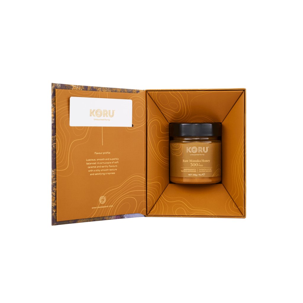 KORU Raw Manuka 300+ MGO má hedvábně hladkou strukturu a uspokojivou ostrost. Skrývá hojnost jemných karamelových a zemitých chutí. Ceněn pro svou vysokou certifikovanou hodnotu MGO má jedinečné přírodní vlastnosti a obsah nejméně 300 mg methylglyoxalu na kg.