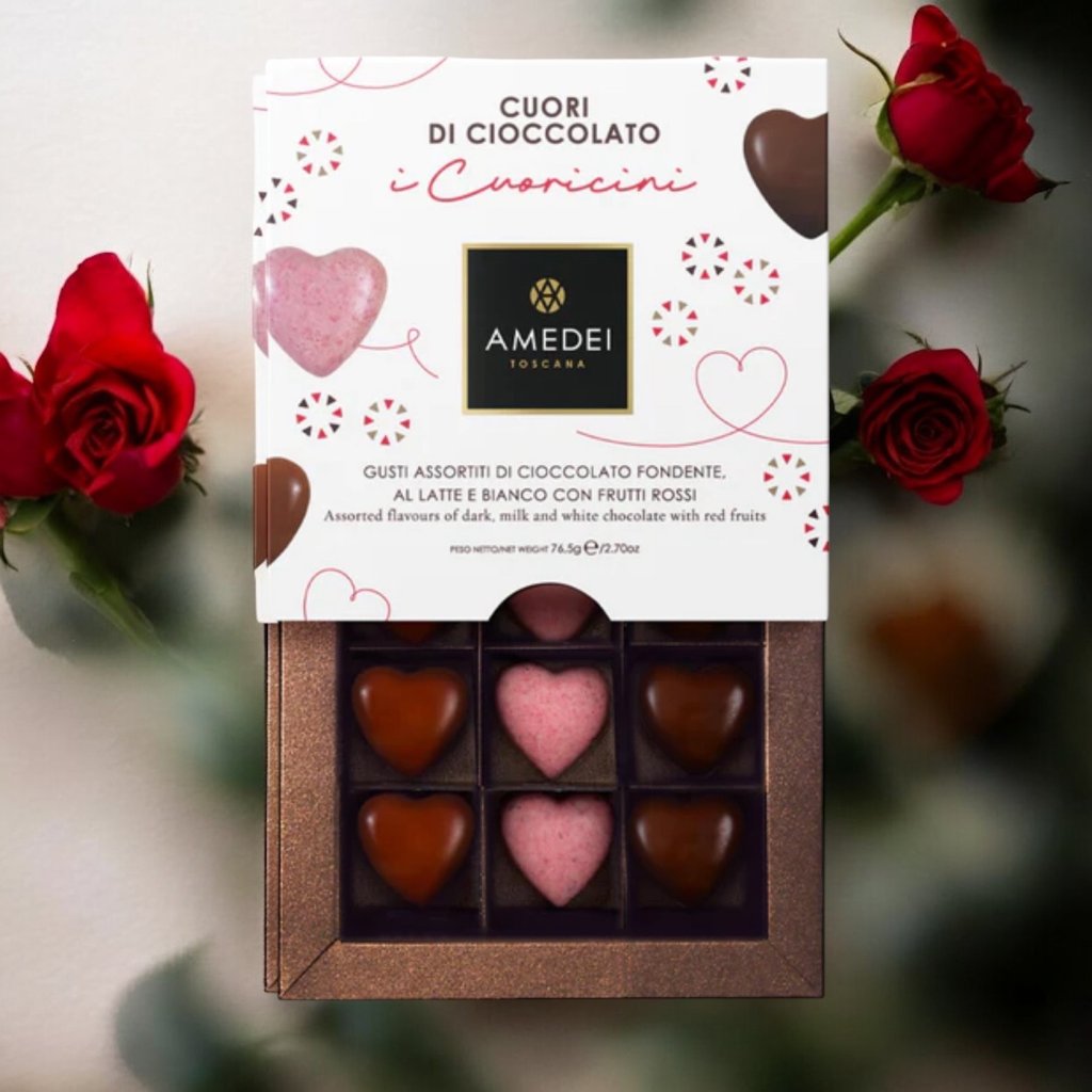 Vzácné gesto, uzavřené v 9ti nebo 20ti čokoládových srdcích (dle varianty produktu): výběr autentické rafinovanosti, ideální pro překvapení těch, které milujete, poselstvím sladkosti a stylu. V tomto sladkém prohlášení náklonnosti se spojují tři mimořádné příchutě: krémovost mléčné čokolády, intenzita tmavé čokolády a neodolatelná novinka, růžové srdce. Růžové srdce, uzavřená v bílé čokoládové skořápce toscano white s červeným ovocným práškem, odhaluje jemné jádro s příchutí lískových oříšků, které si podmaní a zahalí při prvním ochutnání.