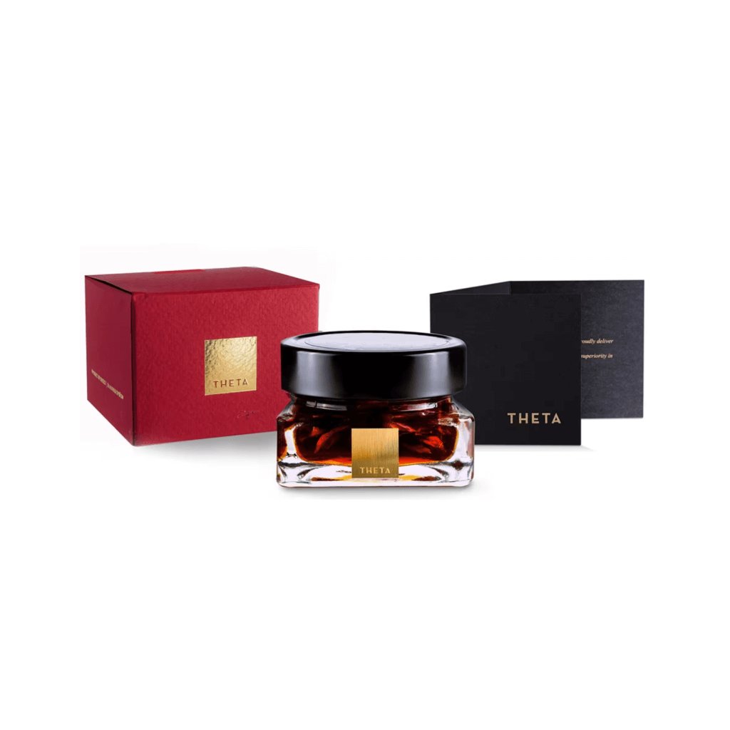 Tento vynikající med s jedlými okvětními lístky růží je balen ve sběratelském kuse čtvercového skleněného medníku z italského vysoce kvalitního skla. Na této designové nádobě je připevněn pozlacený štítek s laserovým gravírováním názvu společnosti: THETA. Dóza je dodávána v luxusní ručně vyráběné matné červené dárkové krabičce.
