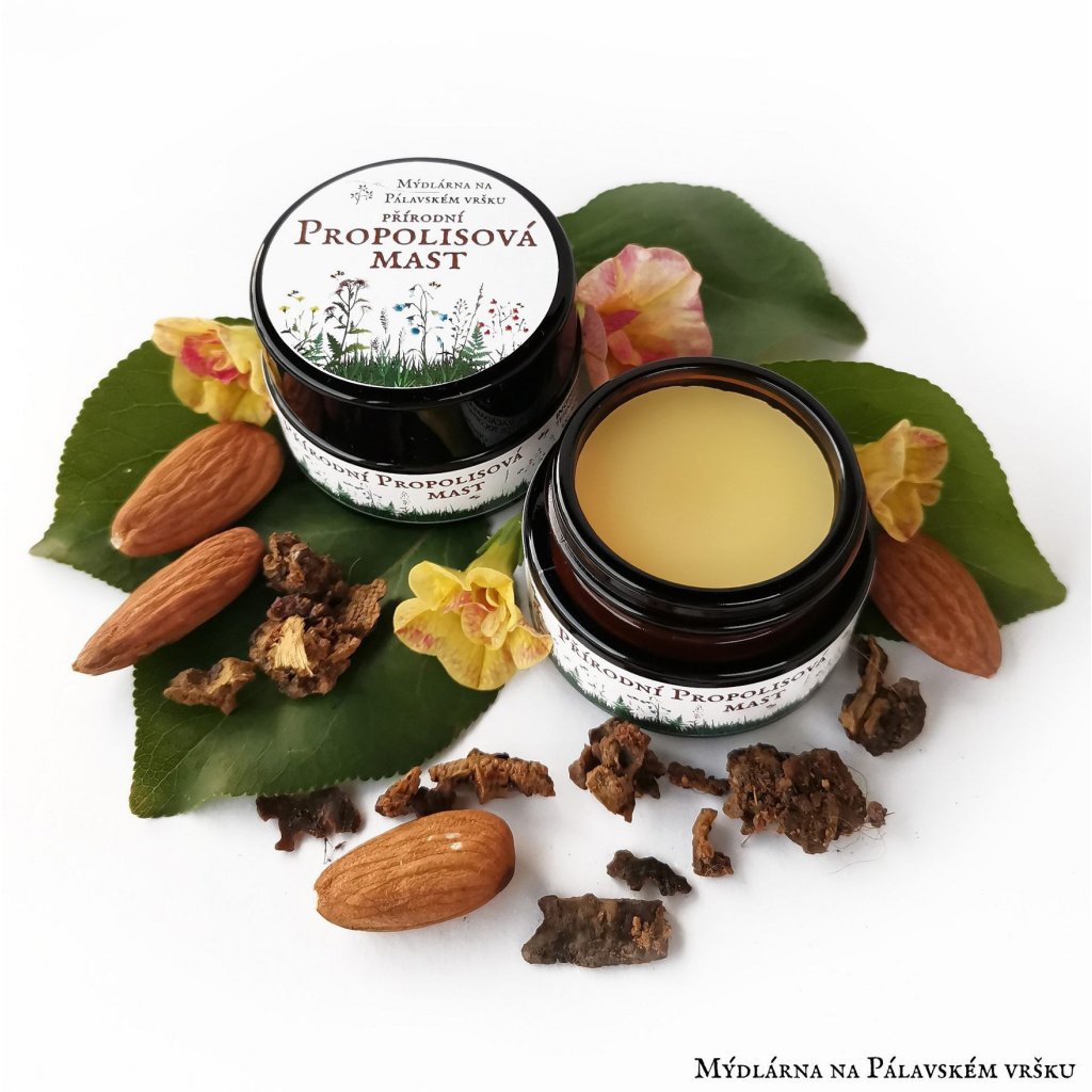 Čistě přírodní propolisová mast vyrobená z pravého propolisu macerovaného v olivovém oleji, bez přidaného alkoholu. Propolis a včelí vosk pochází z lokálního rodinného Včelařství Balaštík v Mutěnicích na Jižní Moravě a je zpracováván tou nejšetrnější metodou bez jakýchkoliv chemických látek. Uchovávají si tak nádhernou vůni a jedinečné vlastnosti. Spolu s obsahem makadamiového, meruňkového oleje a bambuckého másla tvoří jedinečnou mast, která regeneruje pokožku zatíženou různými neduhy a okolními vlivy.