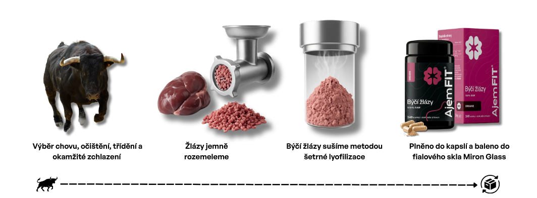 AjemFIT garantuje výběr pouze čistých, funkčních surovin: býčí žlázy z mladých českých býků z horské pastvy a ústřice Magaki z panensky čistých vod Japonska. Produkty jsou osobně testované, plně bez chemie, plnidel, aditiv či GMO. Extrakce, lyofilizace i balení zajišťuje maximální zachování účinnosti – v každé kapsli najdete pouze to nejlepší pro své tělo.