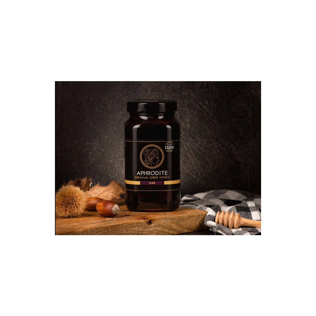Chuť a aroma tohoto dubového medu jsou skutečně výjimečné. Má bohatou a příjemnou karamelovou chuť s mírnou sladkostí, která přechází do dřevitého a kouřového závěru. Tento med se vyznačuje působivou tmavou barvou a dřevitým, kořenitým aromatem. Jeho hustá konzistence a pomalý proces přirozené krystalizace zajišťují, že si svou kapalnou formu uchovává více než 20 měsíců při skladování při pokojové teplotě. Silná chuť surového dubového medu od APHRODITE se skvěle hodí k jogurtu a ořechům, výborně doplňuje uzené či stařené sýry a může povýšit dresink ve vašem salátu na vyšší úroveň.